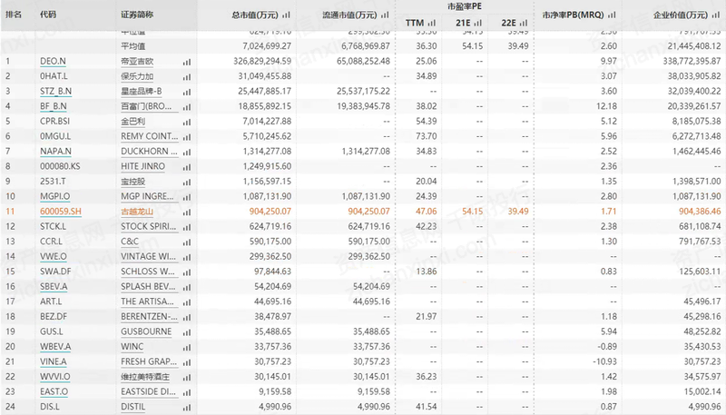 全球领先的高档酒业集团,其产品横贯蒸馏酒、葡萄酒和啤酒三大品类。帝亚吉欧的最新市值24038亿元,2019年营收1538亿元,净利润122亿元,净利润率7.9%。