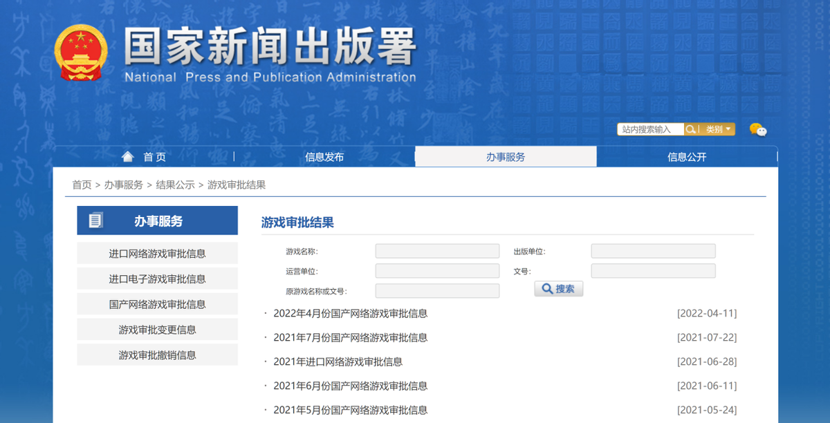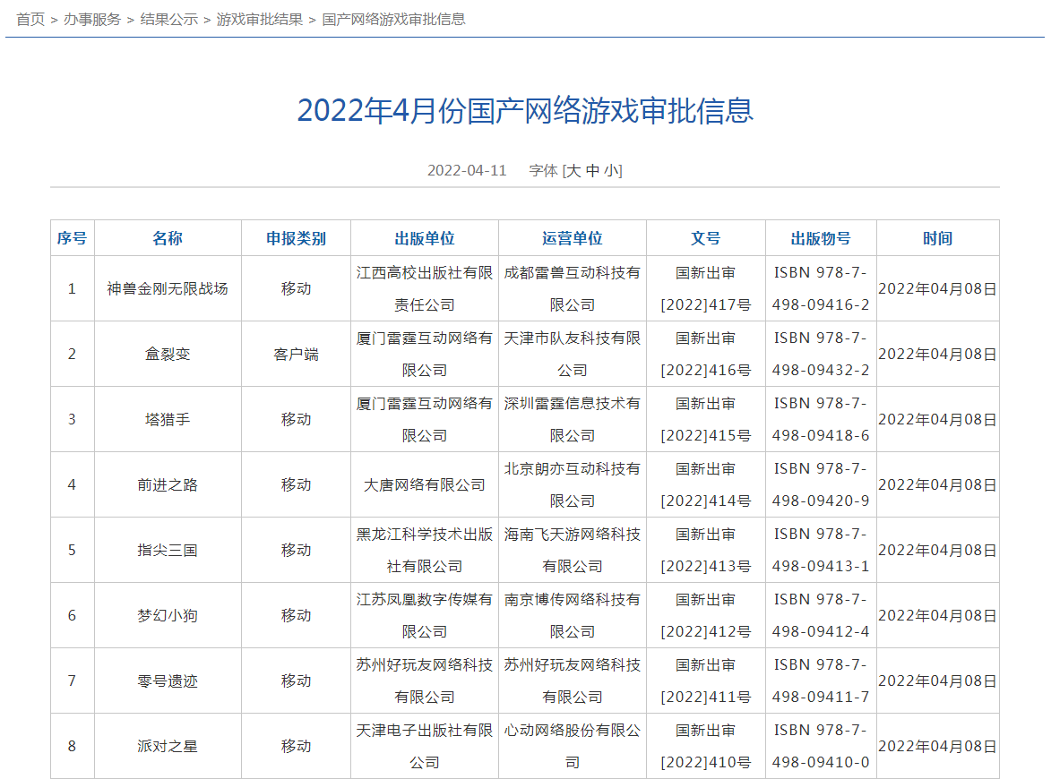 自2021年7月以来的263天后,据国家新闻出版署官方网站显示,最新一批45个国产游戏版号已于2022年4月11日公示通过审批。审批详情显示,这批次游戏具体通过审批时间为4月8日,与此前网络流传的网络游戏出版物号核发单显示的时间一致。
