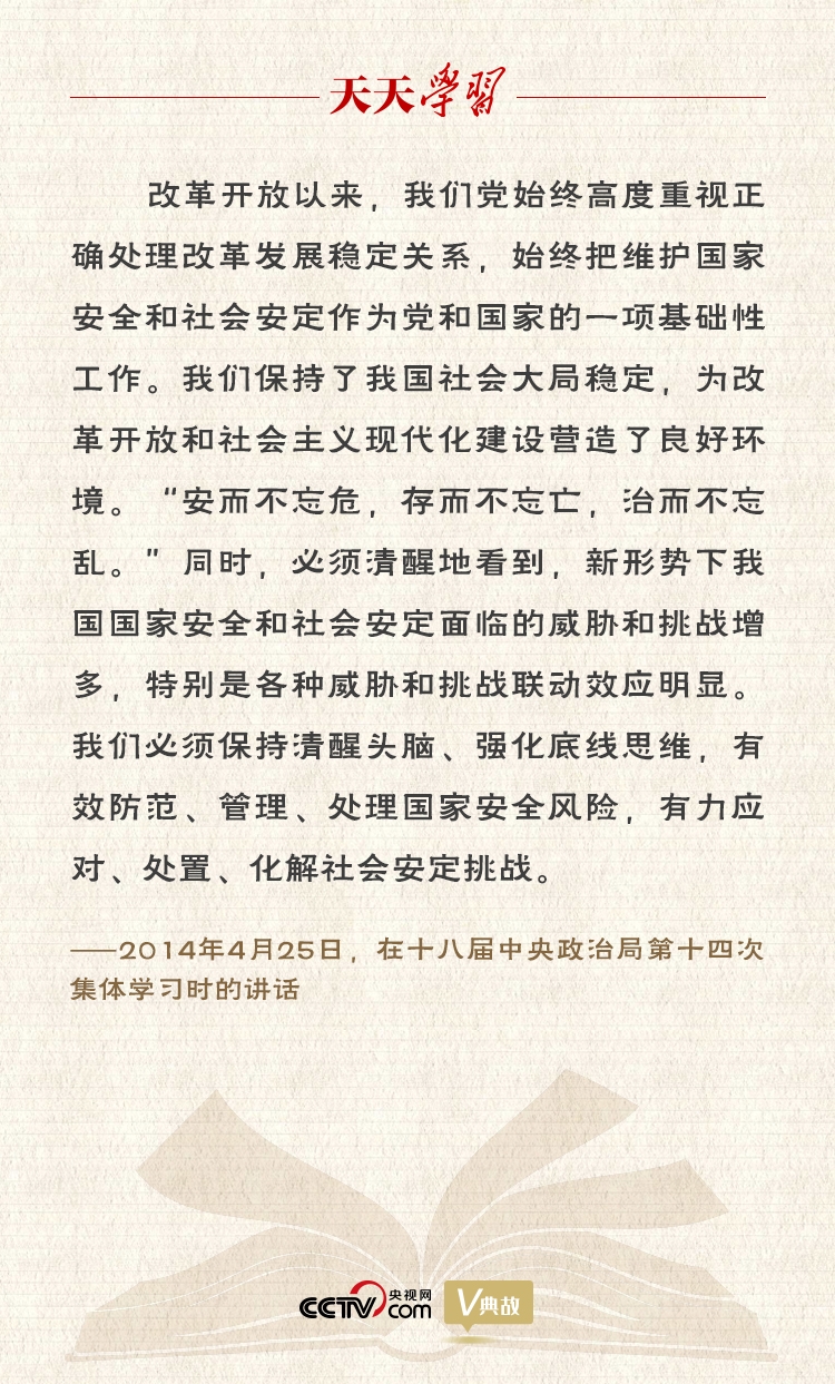 “明者防祸于未萌,智者图患于将来。”虽然我国公共安全形势总体是好的,但必须清醒地认识到,当今世界面临的不稳定性不确定性突出,贫富分化日益严重,地区热点问题此起彼伏,恐怖主义、网络安全、重大传染性疾病等非传统安全威胁持续蔓延,我国正处在改革“攻坚区”“深水区”,各种可以预见和难以预见的风险因素明显增多。我们必须积极主动、未雨绸缪,见微知著、防微杜渐,下好先手棋,打好主动仗,做好应对任何形式的矛盾风险挑战的准备,做好经济上、政治上、文化上、社会上、外交上、军事上各种斗争的准备,层层负责、人人担当,维护国家安全和社会和谐稳定。