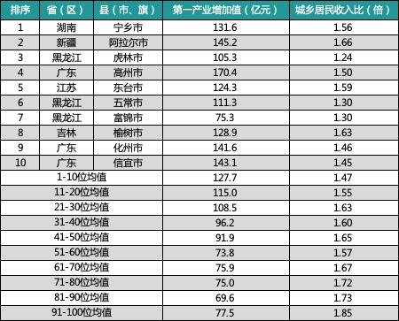 榜单显示,宁乡市、阿拉尔市、虎林市、高州市、东台市、五常市、富锦市、榆树市、化州市、信宜市位列榜单前十,其中广东省和黑龙江省各占3席,席位最多。数据显示,前十强县(市)2020年第一产业增加值均值为127.7亿元,城乡收入比均值为1.47倍,头部领先优势明显。