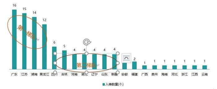 在整体榜单席次分布上,广东、江苏、湖南、黑龙江四省席次分布最广,在各个名次段内均有分布,同时这四个省位于入榜数量的第一梯队,占比接近6成。其中,广东入榜数量最多,有16席;江苏数量排在第二,有15席,湖南入榜14席,黑龙江入榜12席。