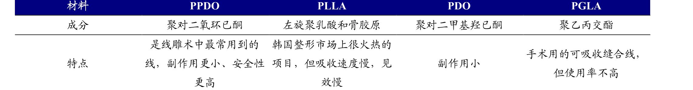 提拉线型号众多,材料不一,保险性和效果不一。目前,提拉线材料一般是 PPDO(聚对二氧环己酮)、PCL(聚己内酯)、PLLA(聚左旋丙交酯)线和PGLA(聚乙丙交酯)。根据线料的形状分为平滑型、螺旋型、锯齿型三种。美商研究院相关报告显示,PPDO指,是当下线雕术中常用到的线,事故率更小,术后效果可维持两年左右;PLLA吸收速度慢,效果能维持5-7年;PDO与PGLA提拉效果仅能维持不到一年。