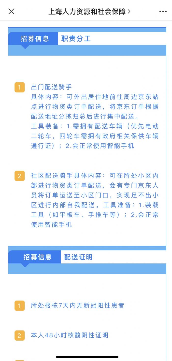 尤其需要注意的是,15日晚8时许,上海市人力资源和社会保障局官方微信发布推文,招募上海保供骑手。21世纪经济报道记者注意到,该骑手分为出门配送骑手以及社区配送骑手,工作内容均围绕京东订单配送展开。