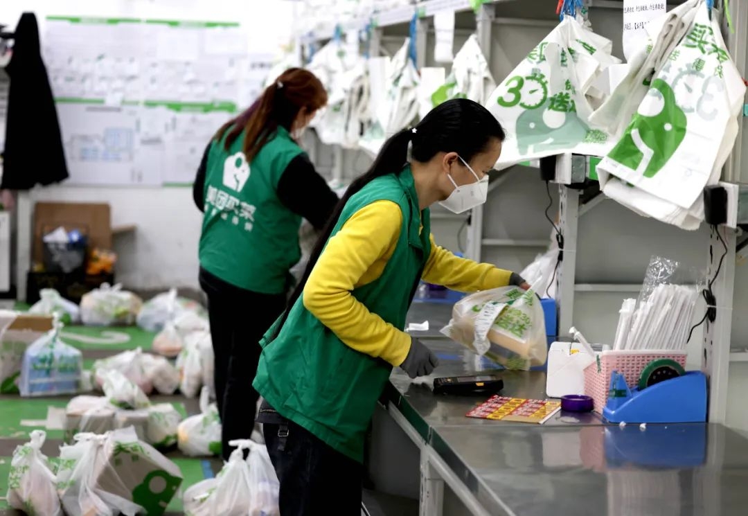 4月12日,在美团买菜上海逸仙路站,工作人员分拣打包订单商品。新华社记者 金立旺 摄