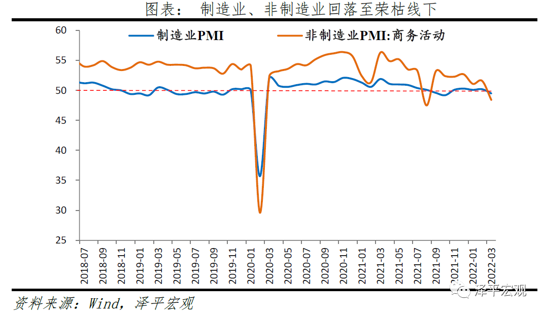 从经济基本面来看,国内面临疫情频发、房地产低迷、中小微企业生产困难、就业形势严峻,国外面临输入性通胀、美联储加息、中美利差倒挂等,经济下行压力加大。去年四季度GDP增速4%,处于潜在增长率以下,今年GDP增速目标5.5%,需要积极作为才能完成。3月国内疫情多地扩散,工业生产和服务业活动受到显著影响。3月制造业PMI为49.5%,较上月下滑0.7个百分点,生产、订单、就业及进出口均降至收缩区间。