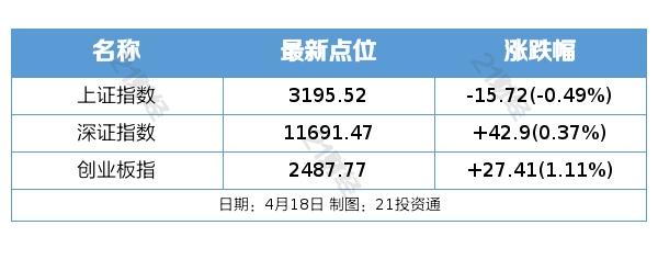 4月18日,A股三大股指涨跌不一。盘面上,汽车零部件、光伏设备、农牧饲渔等板块领涨,煤炭、证券、房地产开发、银行等板块领跌。