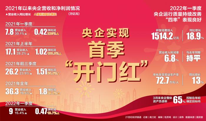而“四率”表现也不错,央企运行质量持续改善。据介绍,一季度中央企业研发经费投入1514.2亿元,同比增长18.9%,研发经费投入强度同比提高0.05个百分点;营业收入利润率6.8%,与去年同期持平,总体保持在较高水平;年化全员劳动生产率72.7万元/人,同比增长13%;3月末中央企业整体资产负债率65%,控制在年初确定目标内。从“两利四率”的指标看,一季度较好实现“两增一控三提高”目标,为实现全年经济运行目标奠定良好基础。