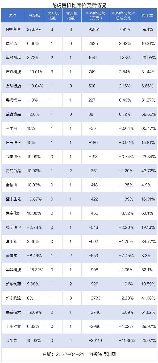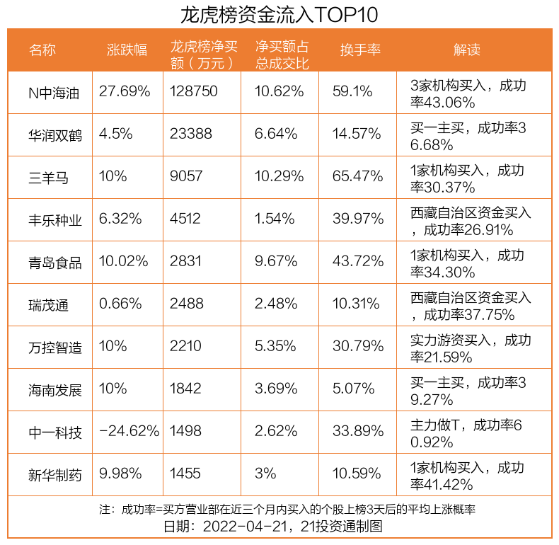 4月21日,上证指数下跌2.26%,深证成指下跌2.7%,创业板指下跌2.17%。盘后龙虎榜数据显示,共有46只个股因当日异动登上龙虎榜,资金净流入最多的是N中海油(600938.SH),达12.87亿元。