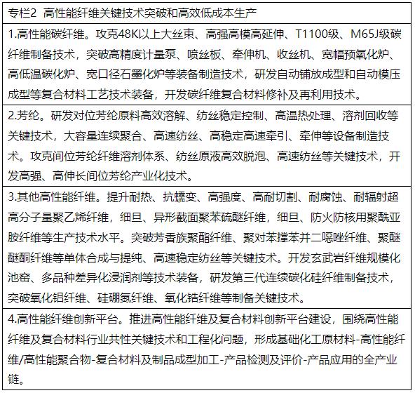 (二)提升高性能纤维生产应用水平。提高碳纤维、芳纶、超高分子量聚乙烯纤维、聚酰亚胺纤维、聚苯硫醚纤维、聚四氟乙烯纤维、连续玄武岩纤维的生产与应用水平,提升高性能纤维质量一致性和批次稳定性。进一步扩大高性能纤维在航空航天、风力和光伏发电、海洋工程、环境保护、安全防护、土工建筑、交通运输等领域应用。