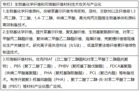 (三)加快生物基化学纤维和可降解纤维材料发展。提升生物基化学纤维单体及原料纯度,加快稳定、高效、低能耗成套技术与装备集成,实现规模化、低成本生产。支持可降解脂肪族聚酯纤维等可降解纤维材料关键技术装备攻关,突破原料制备和高效聚合反应技术瓶颈,加强纤维可降解性能评价,引导下游应用。