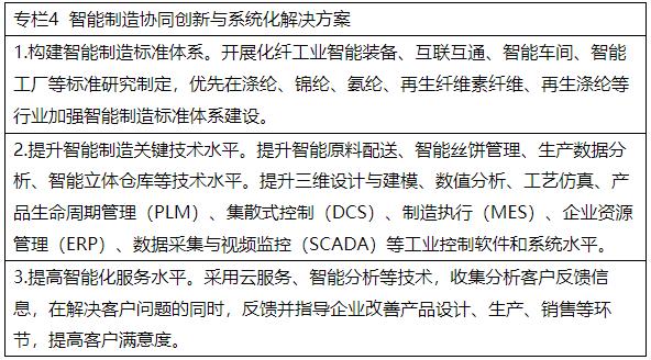 (一)加强智能装备研发应用。推进大集成、低能耗智能物流、自动落筒、自动包装等装备研发及应用,提升纤维自动化、智能化生产水平。加快涤纶加弹设备自动生头装置及在线质量监测系统的研发及应用,提高涤纶、氨纶、锦纶的纺丝、卷绕装备智能化水平。