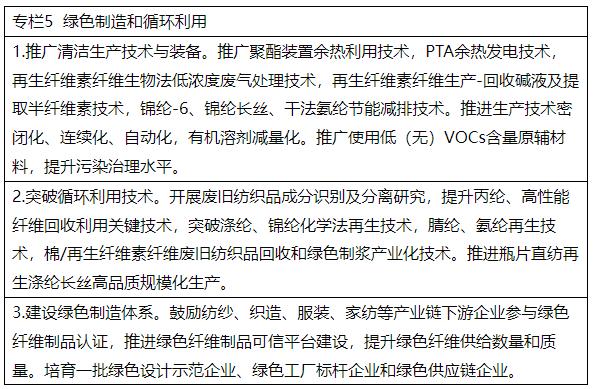 (二)提高循环利用水平。实现化学法再生涤纶规模化、低成本生产,推进再生锦纶、再生丙纶、再生氨纶、再生腈纶、再生粘胶纤维、再生高性能纤维等品种的关键技术研发和产业化。推动废旧纺织品高值化利用的关键技术突破和产业化发展,加大对废旧军服、校服、警服、工装等制服的回收利用力度,鼓励相关生产企业建立回收利用体系。