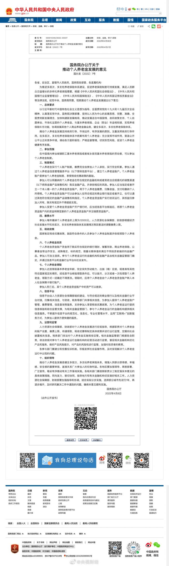 4月21日,国务院办公厅发布《关于推动个人养老金发展的意见》。根据《意见》,在中国境内参加城镇职工基本养老保险或者城乡居民基本养老保险的劳动者,可以参加个人养老金制度。参加人每年缴纳个人养老金的上限为12000元。人力资源社会保障部、财政部根据经济社会发展水平和多层次、多支柱养老保险体系发展情况等因素适时调整缴费上限。个人养老金资金账户资金用于购买符合规定的银行理财、储蓄存款、商业养老保险、公募基金等运作安全、成熟稳定、标的规范、侧重长期保值的满足不同投资者偏好的金融产品,参加人可自主选择。参与个人养老金运行的金融机构和金融产品由相关金融监管部门确定,并通过信息平台和金融行业平台向社会发布。