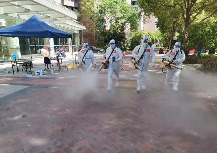 团队抽调了十几人,分三组,两班倒,进行昼夜两次社区全覆盖消杀。抗疫工作进展顺利,得益于援沪团队与项目上原有团队合力做了一套非常完整的抗疫方案:从垃圾消杀、清运,到核酸异常户的管控,再到整个空间的立体消杀,以及社区专用动线,比如说阳性的动线、留观点的规划,方案都考虑到了。