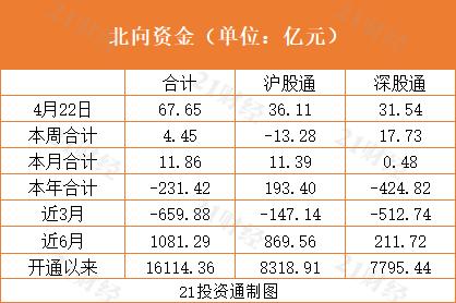据21投资通(微信号ID:touzit21)智能监测,北向资金全天净买入67.65亿元,其中沪股通净买入36.11亿元,深股通净买入31.54亿元。