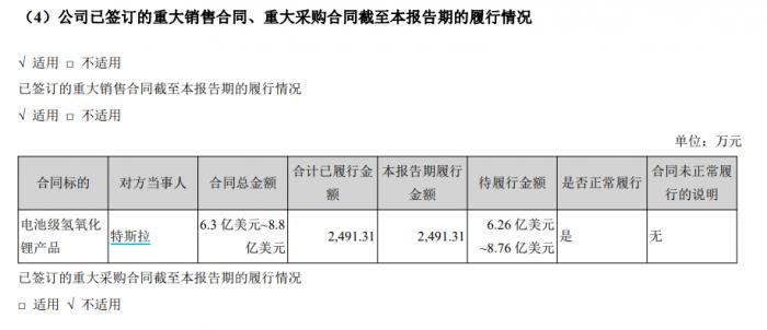 不过,在过去一年,雅化集团与特斯拉的电池级氢氧化锂合同执行金额尚小。上述合同总金额为6.3亿-8.8亿美元,2021年已履行部分仅有2491.31万元(约390万美元),尚有6.26亿-8.76亿美元待履行。