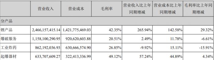 去年,公司锂产品毛利率提升29.32个百分点至42.35%,显著高于爆破服务、工业炸药两项产品。