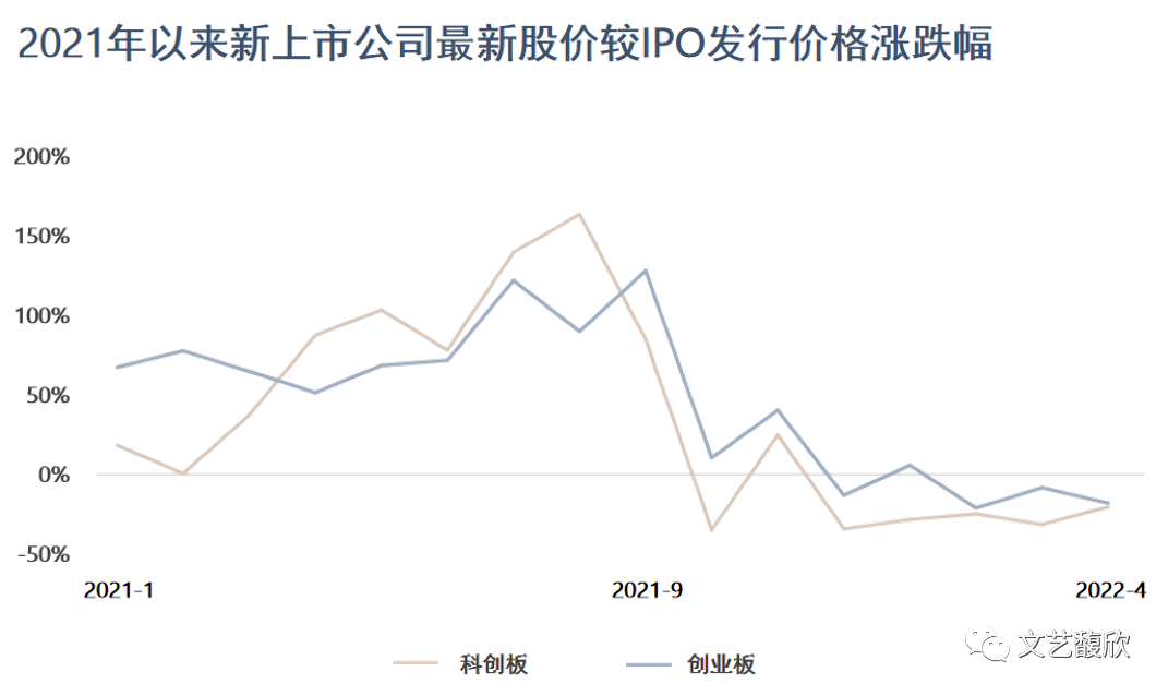 另一方面,今年以来市场行情持续下行,生物科技等热门行业也在经历估值回调,科创板指数、创业板指数年初至今分别下跌29.53%、28.86%,而A股前几次破发潮也正是处于宏观环境走弱、市场情绪较低的时期,市场行情加剧了破发潮的出现。但可以看到,目前上市公司最新股价相对于发行价格的涨跌幅正在往更理性的方向靠拢,这也体现了一二级市场的估值共识正在建立。