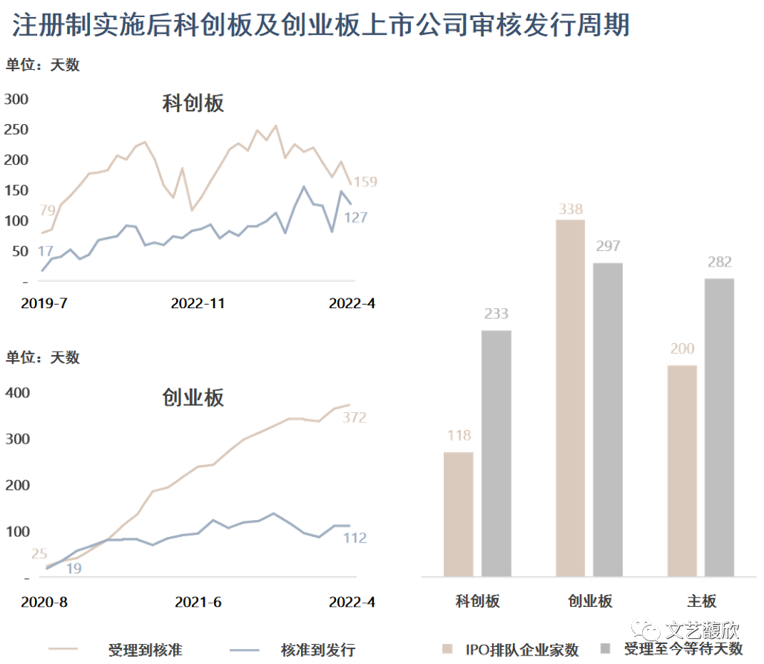 到2022年4月20日,科创板IPO排队的118家企业受理至今平均已经等待了233天,创业板IPO排队的338家企业受理至今平均已经等待了297天。与主板2019年后受理的200家在排队企业平均等待282天相比,注册制审核效率的优势被大幅削弱,而无论是审核端还是发行端都给上市公司带来了更高的时间成本。