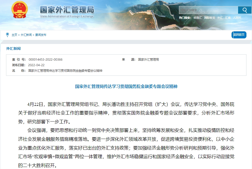 国家外汇管理局强调,要进一步深化外汇领域改革开放,促进跨境贸易投资便利化,以中小企业为重点优化外汇服务,落实好已出台的外汇支持政策;要加强经济金融形势分析研判和预期引导,强化外汇市场“宏观审慎+微观监管”两位一体管理,维护外汇市场稳健运行和国家经济金融安全,以实际行动迎接党的二十大胜利召开。