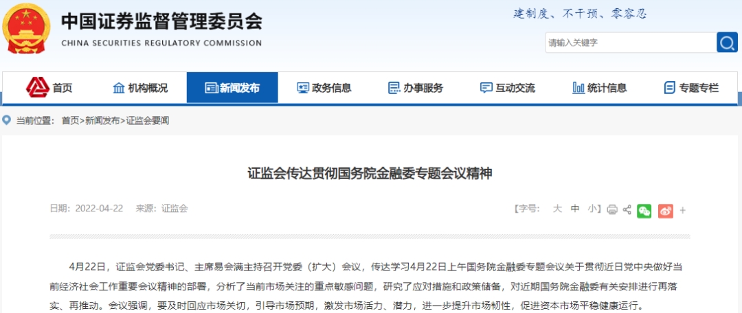 证监会党委书记、主席易会满主持召开党委(扩大)会议,传达学习4月22日上午国务院金融委专题会议关于贯彻近日党中央做好当前经济社会工作重要会议精神的部署,分析了当前市场关注的重点敏感问题,研究了应对措施和政策储备,对近期国务院金融委有关安排进行再落实、再推动。会议强调,要及时回应市场关切,引导市场预期,激发市场活力、潜力,进一步提升市场韧性,促进资本市场平稳健康运行。