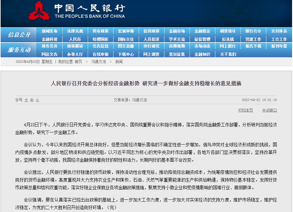 人民银行召开党委会,学习传达党中央、国务院重要会议和指示精神,落实国务院金融委工作部署,分析研判当前经济金融形势,研究下一步金融工作。会议认为,今年以来我国经济开局总体良好,但是当前经济增长面临的不确定性进一步增加,俄乌冲突对全球经济形成新的挑战,国内疫情多点散发,部分地区物流和供应链受阻。以习近平同志为核心的党中央及时作出部署,各地方各部门坚决贯彻落实,坚持改革开放,坚持两个毫不动摇,我国经济金融保持着良好的韧性和活力,长期向好的基本面不会改变。