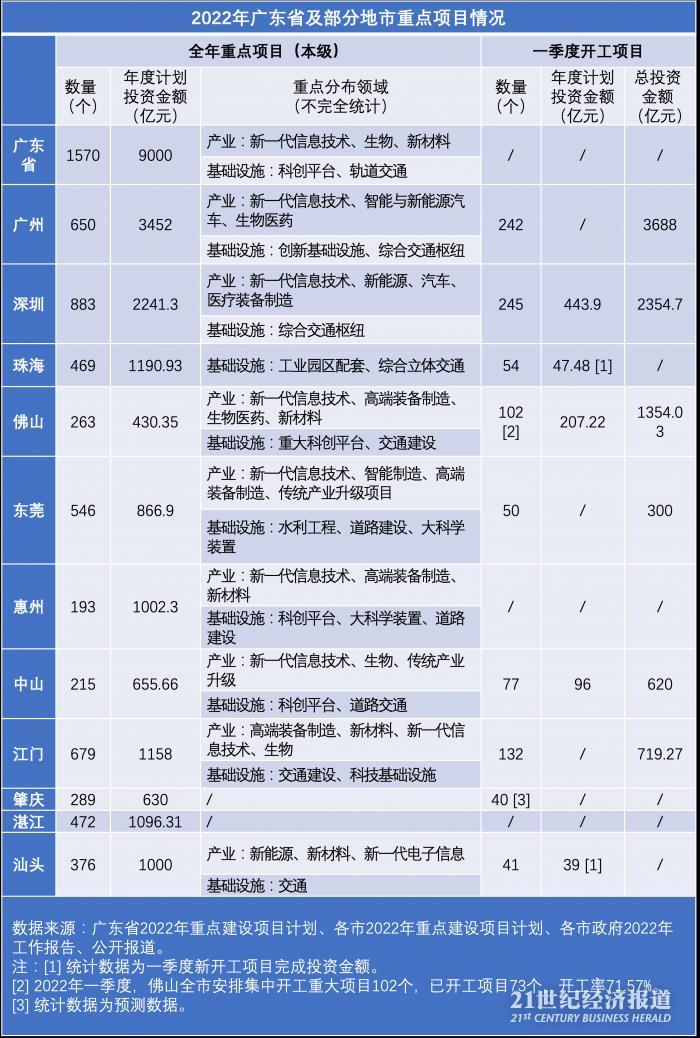 据南方财经全媒体记者不完全统计,一季度仅粤港澳大湾区内地9市已有超940个重大项目开工建设,包括以新一代信息技术为代表的高技术制造业,以科创平台、大科学装置为代表的新型基础设施。