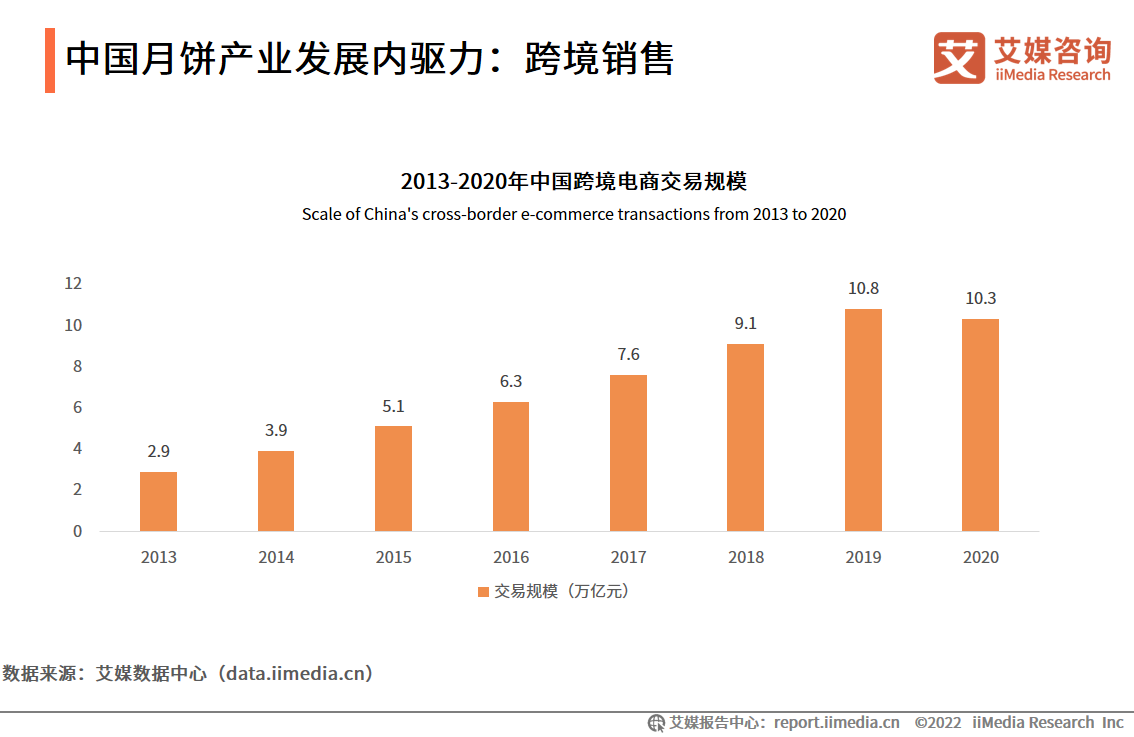 数据显示,中国跨境电商交易规模逐年扩大,2020年由于受到疫情的影响,中国跨境电商交易市场规模有所下滑,交易规模为10.3万亿元。艾媒咨询分析师认为,月饼的生产逐渐朝着小型化、低糖化、多样化的方向发展,更加符合西方现代餐饮的营养标准。跨境电商扩大了月饼的销售范围,月饼由国内作为传统食品销售,逐渐扩大到海外市场。