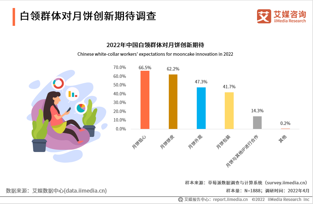 iiMedia Research(艾媒咨询)数据显示,2022年,白领群体对月饼最期待的创新是月饼馅心(66.5%),其次是月饼饼皮(62.2%),月饼外观和包装以及和IP进行联名合作,也是白领群体对月饼期待的方面。艾媒咨询分析师认为,口味是白领群体最为关注的因素,好看的包装和月饼外观同样也是吸引白领群体购买的重要因素。
