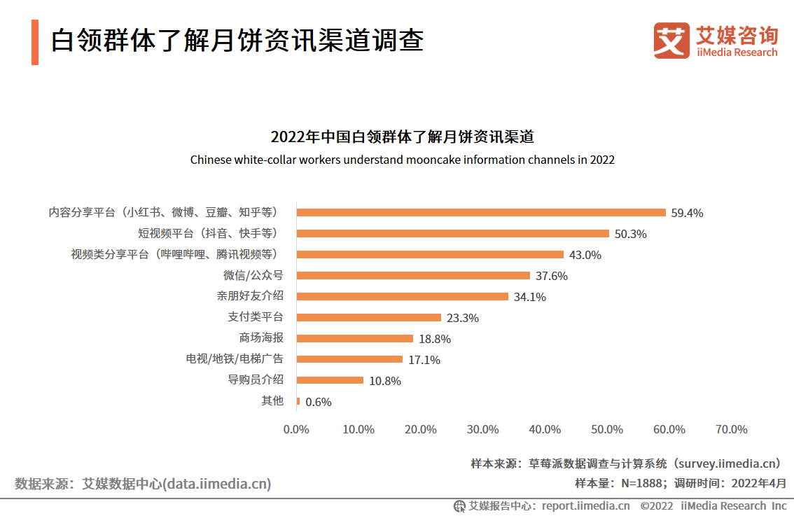iiMedia Research(艾媒咨询)数据显示,白领群体主要是从内容分享平台和短视频平台获取月饼的资讯信息,占比分别为59.4%和50.3%;其次是短视频分享平台(43%)、微信/公众号(37.6%)和亲朋好友(34.1%)等渠道。艾媒咨询分析师认为,互联网的发展推动了内容分享平台和短视频平台的发展,此类平台的广告和推广信息等更容易触达到白领群体。