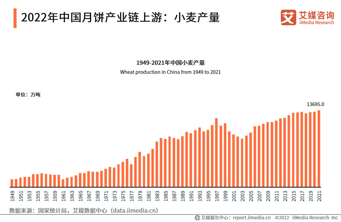 小麦是月饼产业上游面粉、饼皮等材料的重要来源。数据显示,中国小麦产量保持上涨趋势,2021年产量达13695.0万吨。艾媒咨询分析师认为,上游产业的小麦产量增长,可以保障月饼上游产品供应,利于月饼行业平稳发展。