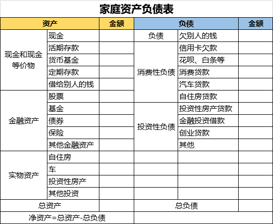 首先要对目前的资产情况做一个完整的梳理,可以做一个家庭的资产负债表。需要评估的点主要有:1、资产结构是否健康;2、让你失血最多的是什么?是下跌的基金还是过度的消费,或是失败的房产投资?