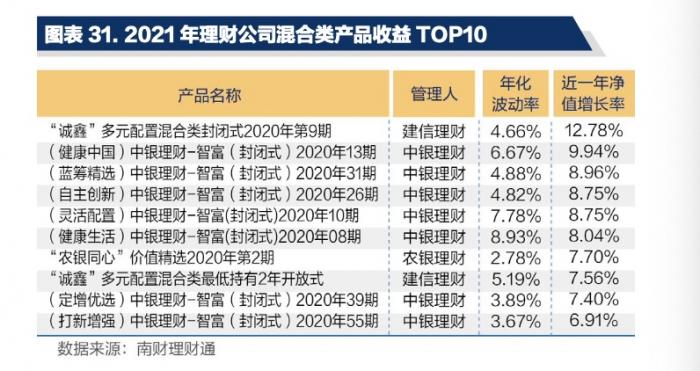 截至2021年末,建信理财“‘诚鑫’多元配置混合类封闭式2020年第9期”以12.78%的年度涨幅摘得2021混合类公募型理财产品年度榜单桂冠。
