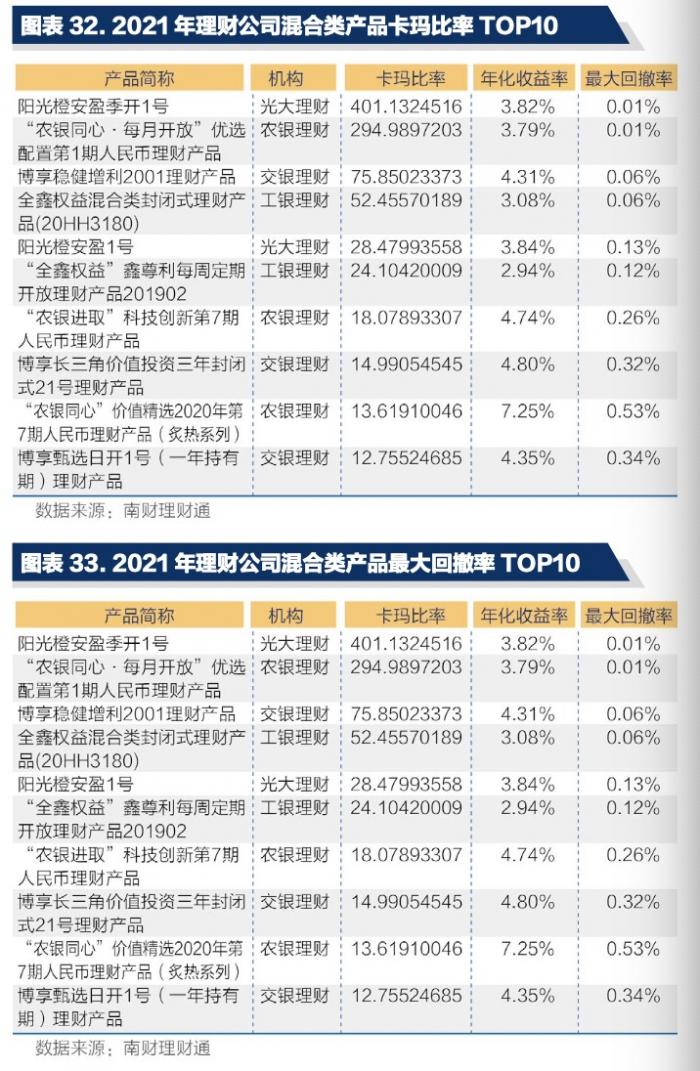 从风险调整后收益看,光大理财“阳光橙安盈季开1号”排名第一,其卡玛比率达401.13,年化收益率为3.82%。排名第二和第三的分别为农银理财发行的“农银同心·每月开放优选配置第1期”和交银理财发行的“博享稳健增利2001”,卡玛比率依次为294.99和75.85。(卡玛比率为风险调整后收益指标,是年化收益率与最大回撤的比率。)