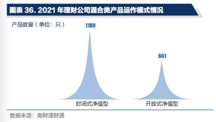 从产品运作模式来看,截至2021年12月末,理财公司的混合类封闭式净值型产品和开放式净值型产品分别为1189只和661只。事实上,混合类理财投资比例较为灵活,一方面管理人可以根据市场情况及时调整投资策略,但另一方面也对管理人的主动管理能力提出更高要求。相较开放式产品,封闭式产品更利于产品管理人遵循自身的投资准则并践行长期投资主义,避免赎回资金对持仓的干扰。