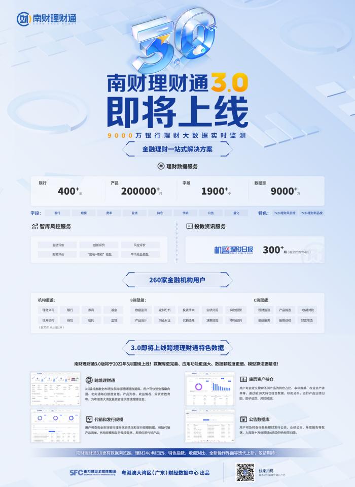 2022年4月25日,南方财经全媒体集团、南财理财通、21世纪经济报道成功举办“2022年首期银行理财线上策略会”。本次会议不仅聚焦2021年银行理财运行情况,还对后市投资策略进行了深入研讨。本次策略会南财理财通课题组重磅发布了《2021银行理财年度运作报告》及年度产品收益榜单,由粤港澳大湾区(广东)财经数据中心出品。