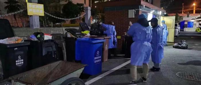 小区的垃圾清运工作也主要由志愿者来完成。每天早上七点到七点半,居民们会在将垃圾放在门口。黄荣耀和另外三个志愿者会在这22栋没有电梯的居民楼内奔波上下,并用一个小时左右的时间收完全部垃圾。