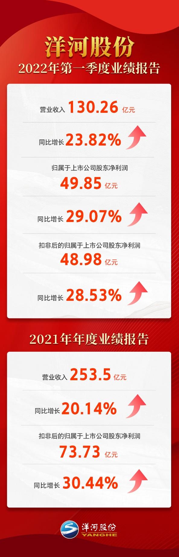 2022年一季度,洋河股份实现营业收入130.26亿元,同比增长23.82%;归属于上市公司股东净利润49.85亿元,同比增长29.07%;扣非后的归属于上市公司股东净利润48.98亿元,同比增长28.53%。这无疑是此前洋河“高成长”建设的延续,产品力、品牌力、渠道力的全面释放,将持续有力推动洋河的价值回归和市场回归。