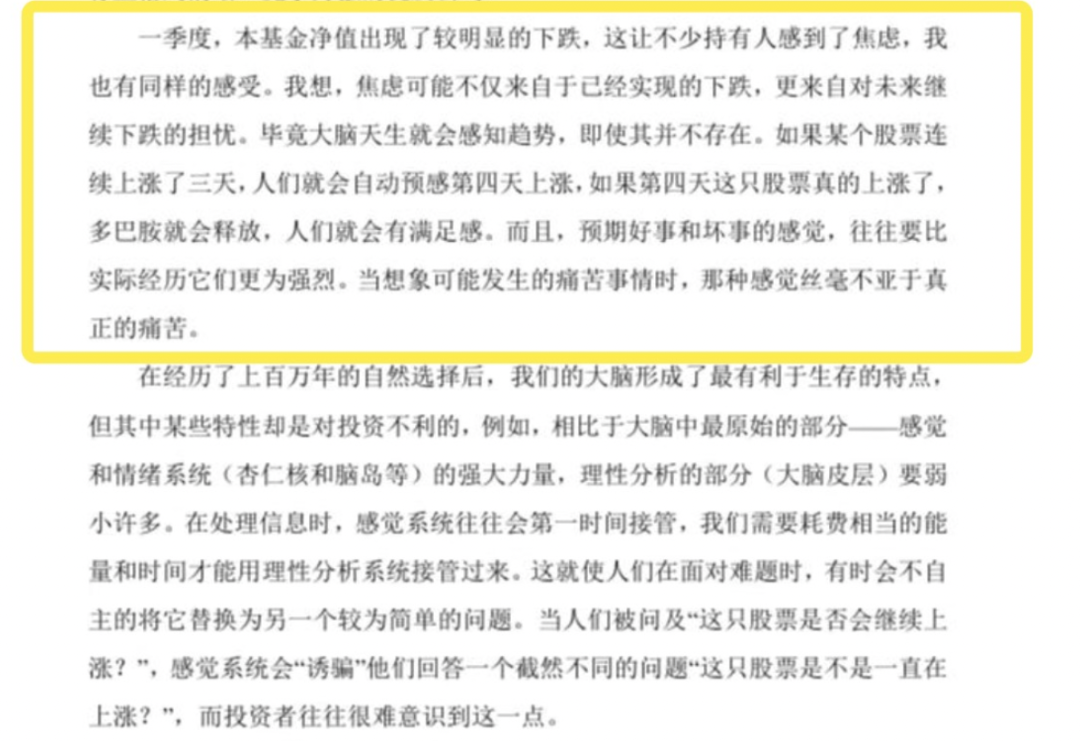 果不其然,面对惨烈的基金市场现状,这些千亿基金经理一瞬间就化身成了鸡汤高手,蔡嵩松、葛兰、焦巍、傅鹏博等人站出来告诉基民们,要坚守、不要怕。张坤甚至从生物学角度用“大脑理论”来为基民解释为什么会在股市中会受到伤害,并提出如下自省式化解办法: