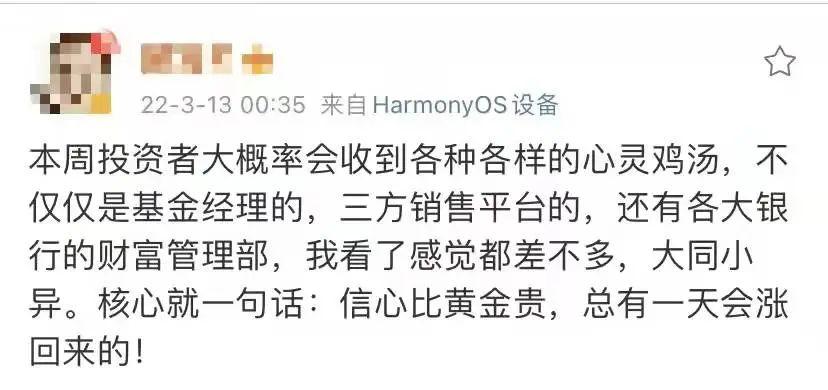实际上,受今年春节过后A股调整影响,基金市场未见开门红。有财经博主已经发博称,春节之后的朋友圈,基本上都是基金经理在发各种心灵鸡汤。随着3月份市场行情进一步低迷,也有人预测到,投资者大概率会收到各种各样的心灵鸡汤,不仅是基金经理的,还有三方销售平台,以及各大银行的财富管理部,核心就一句话:信心比黄金贵,总有一天会涨回来的。