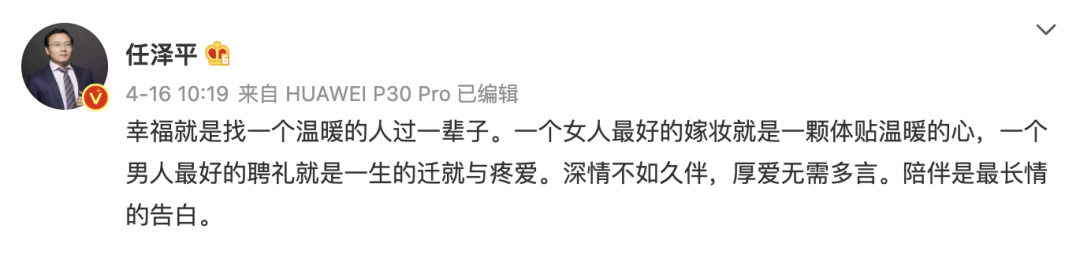 今年3月开始,有网友发现,微博解禁归来的任泽平在其微博、视频号以及公众号等社交平台开始和网友们聊一些关于家庭、婚姻和生活的话题。