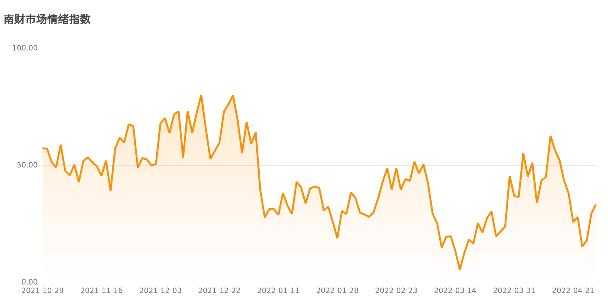 今日南财市场情绪指数为33.4,较前日29.5上涨,市场投资热度提升。A股市场的行为是非常情绪化的,当市场上涨时,投资者趋于贪婪,产生追涨情绪;当市场下跌时,往往会失去理智急于出售他们的资产。为量化投资者当前对购买股票的情绪程度,基于中国波指(iVIX)与CNN恐慌贪婪指数,南财量化团队挑选出五大指标,综合加权得到了南财情绪指数。南财情绪指数范围从0-100,越低表明市场投资热度较低,越高表明市场投资热度较高。南财情绪指数有助于市场参与者更好地认识和分析股票市场的波动风险和跳跃风险,市场投资热度偏低表明投资者过于担心,如果当前市场定价并不高,这可能是一个买入机会。市场投资热度偏高则表明投资者过于兴奋,如果市场处于高位,市场可能会进行调整。南财情绪指数的发布,不仅有利于投资者进行更佳的风险管理,也为维持金融市场的稳定繁荣提供了有效的参考依据。
