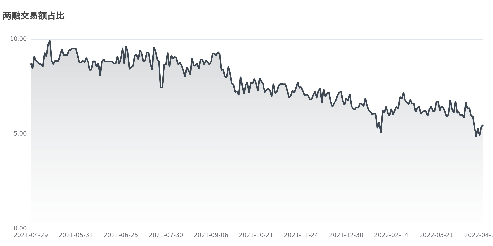 今日该指标值为5.47%,目前该指标处于近一年较低区间,说明投资者认为A股市场趋于触底反弹。反映场内投资者借钱炒股的杠杆水平,该指标越高说明杠杆水平越高,即投资者认为当前市场较强,反之则说明投资者认为市场相对较弱,因而与上证指数存在较强的正相关性。