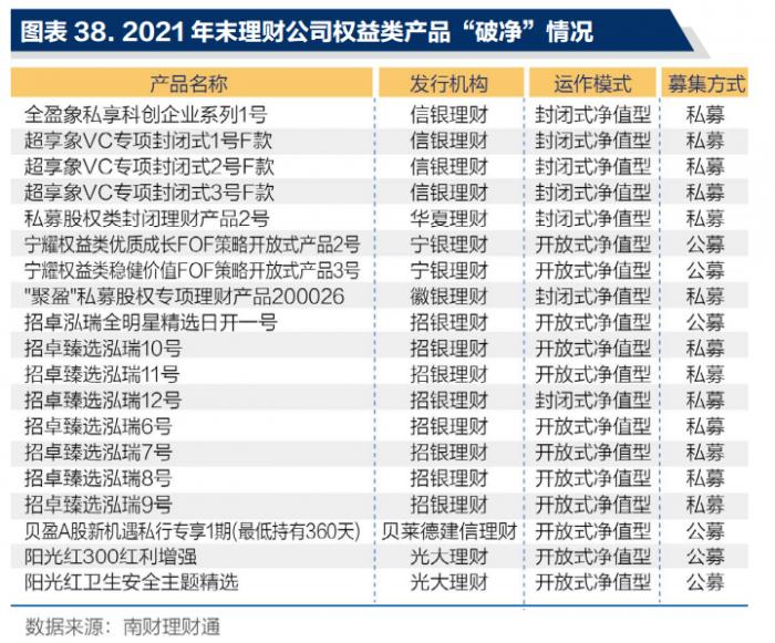 从理财公司权益类产品表现看,南财理财通数据显示,在处于存续期的143只权益类产品中,有19只在2021年末净值小于1。