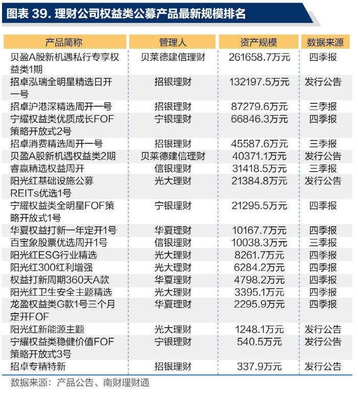 具体来看,截至四季度末,贝莱德建信理财的首款产品“贝盈A股新机遇私行专享1期”存续规模稳居首位,达到26.17亿元,远超中资理财公司单个产品体量。课题组认为,这主要与理财公司自身的战略布局有关。贝莱德建信理财作为合资理财公司,利用外资方先进的投资理念和强大的投研实力,主打权益投资,瞄准中国图表39.理财公司权益类公募产品最新规模排名第三章理财风云榜582021银行理财年度运作报告59市场。而中资理财公司则依托母行在信贷体系下积累起来的信用投研优势,聚焦固收研究,产品定位以“固收+”为主,权益投资能力仍处于不断巩固和加强的阶段。
