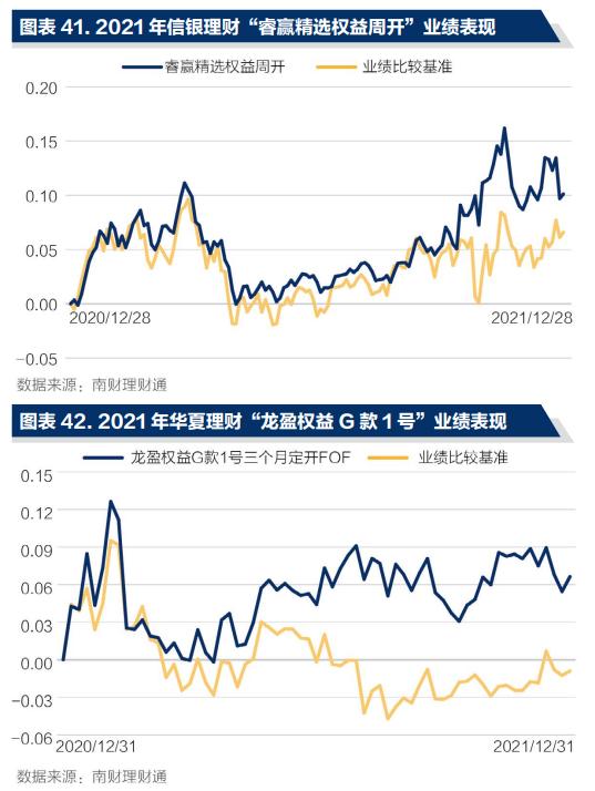 另外,就业绩比较基准而言,两款产品的实际业绩走势和比较基准较为吻合,说明产品在运作时遵守业绩比较基准设计。同时,两款产品均在2021年跑赢业绩比较基准。