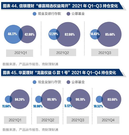 从持仓情况看,两款产品主要投向现金及银行存款和公募基金两类资产。具体来看,两款产品前三季度投向公募基金的资产占比均呈逐季上升趋势。截至2021年三季度末,“睿赢精选权益周开”的公募基金持仓占总资产比例达85.44%,而“龙盈权益G款1号”的公募基金资产占比更高,达90.7%。