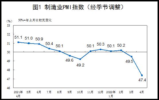 4月30日,国家统计局数据显示,4月份制造业采购经理指数(PMI)为47.4%,比上月下降2.1个百分点,制造业总体景气水平继续回落,达到自2020年3月以来的最低值。