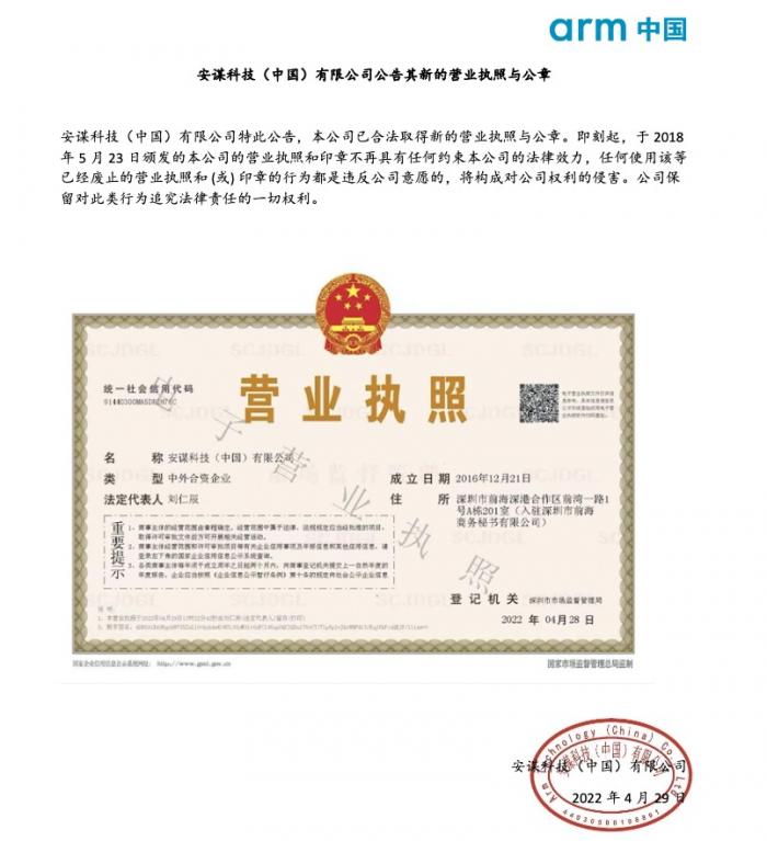安谋科技(中国)有限公司特此公告,本公司已合法取得新的营业执照与公章。即刻起,于2018年5月23日颁发的本公司的营业执照和印章不再具有任何约束本公司的法律效力,任何使用该等已经废止的营业执照和 (或) 印章的行为都是违反公司意愿的,将构成对公司权利的侵害。公司保留对此类行为追究法律责任的一切权利。