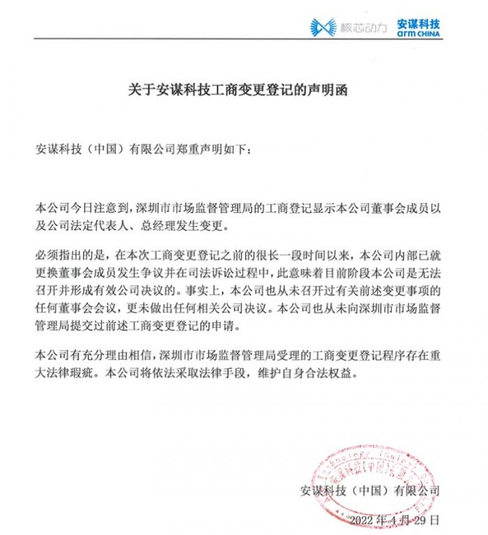 在4月29日午间,以吴雄昂所带领团队的安谋科技曾针对工商信息变更进行回应,对28日公司完成工商变更登记的程序提出存在重大法律瑕疵的异议,并称将依法采取法律手段,维护自身合法权益。